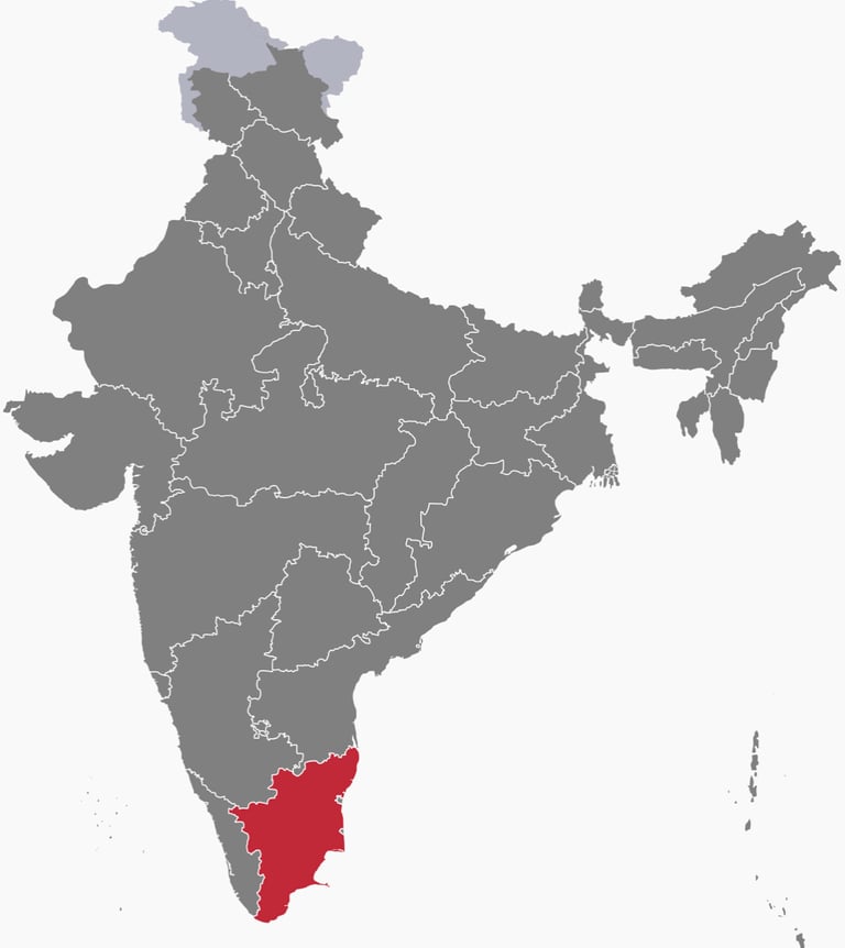 Le Tamil Nadu est l'état le plus au sud de l'Inde, localisé sur la côte sud-ouest de la péninsule indienne. On y parle le Tamil, un des plus ancien language classique ayant survécu.