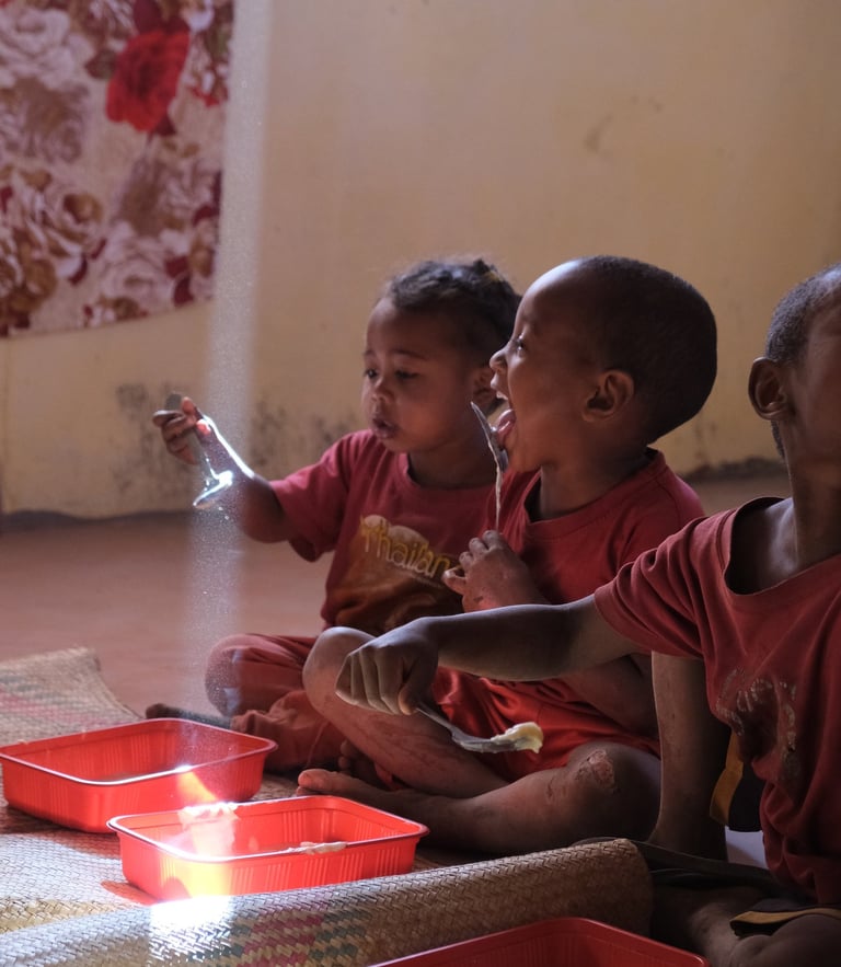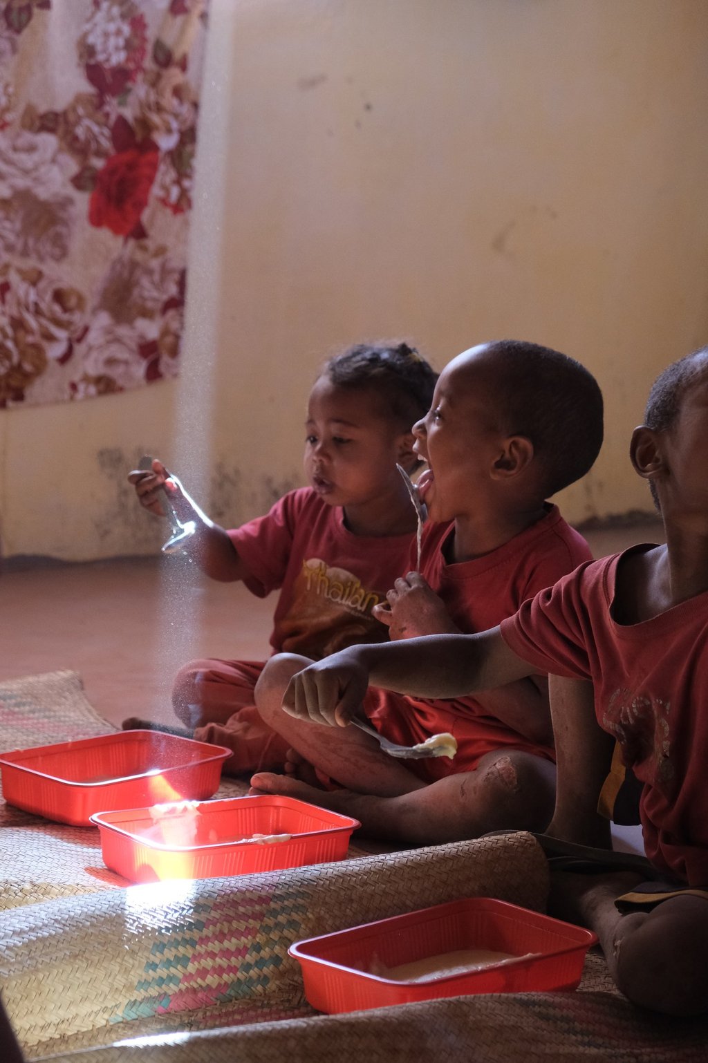 Enfants mangeant le koba au centre Soakilonga d'Ankily à Ihosy, août 2024.