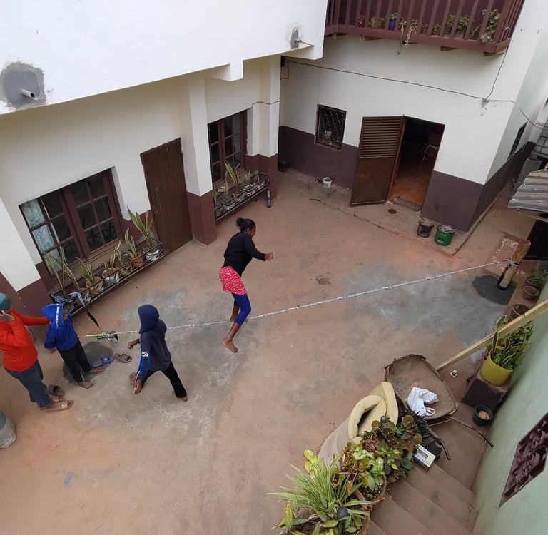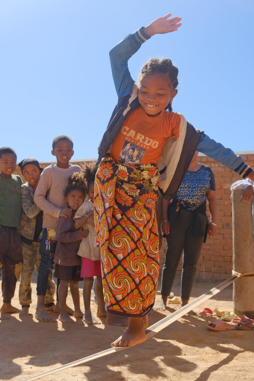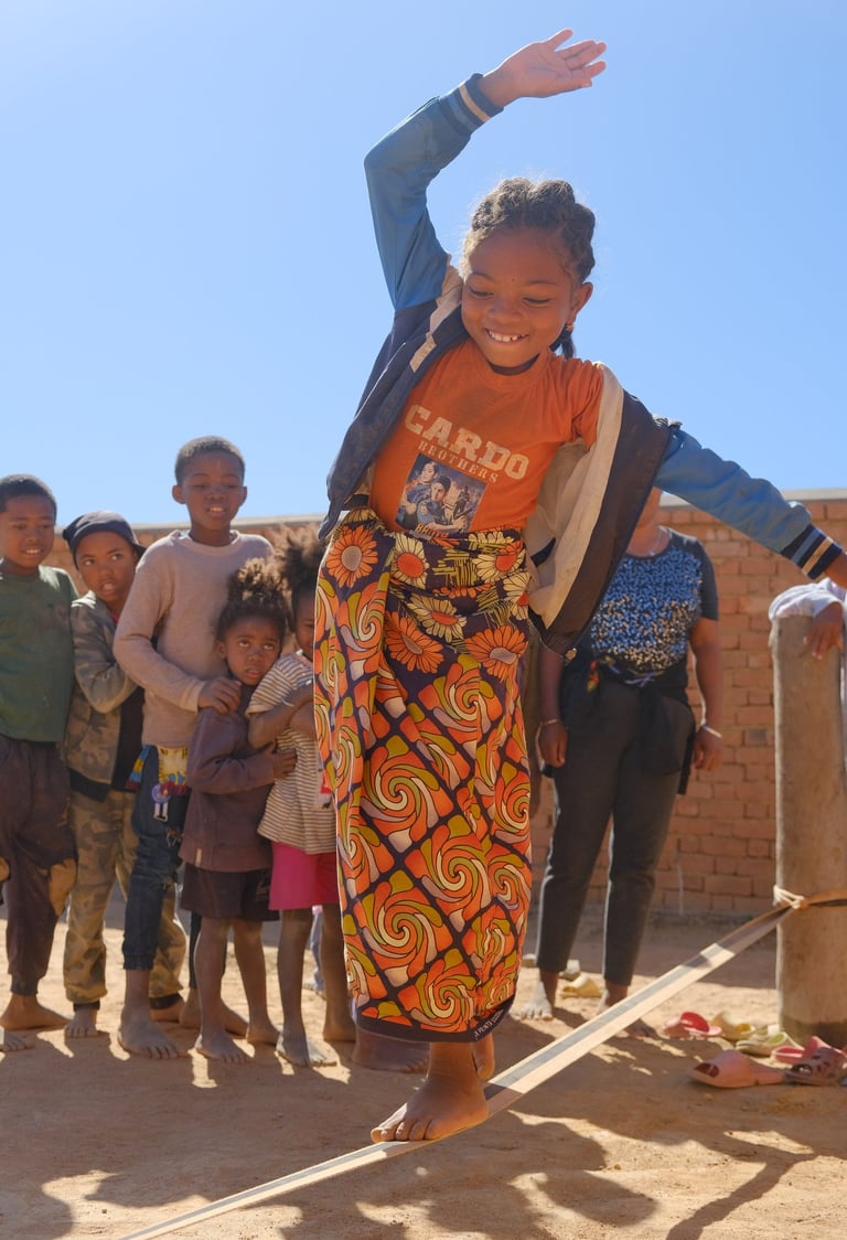 Introduction à la slackline au centre Soakilonga d'Ankily, à Ihosy, en août 2024.