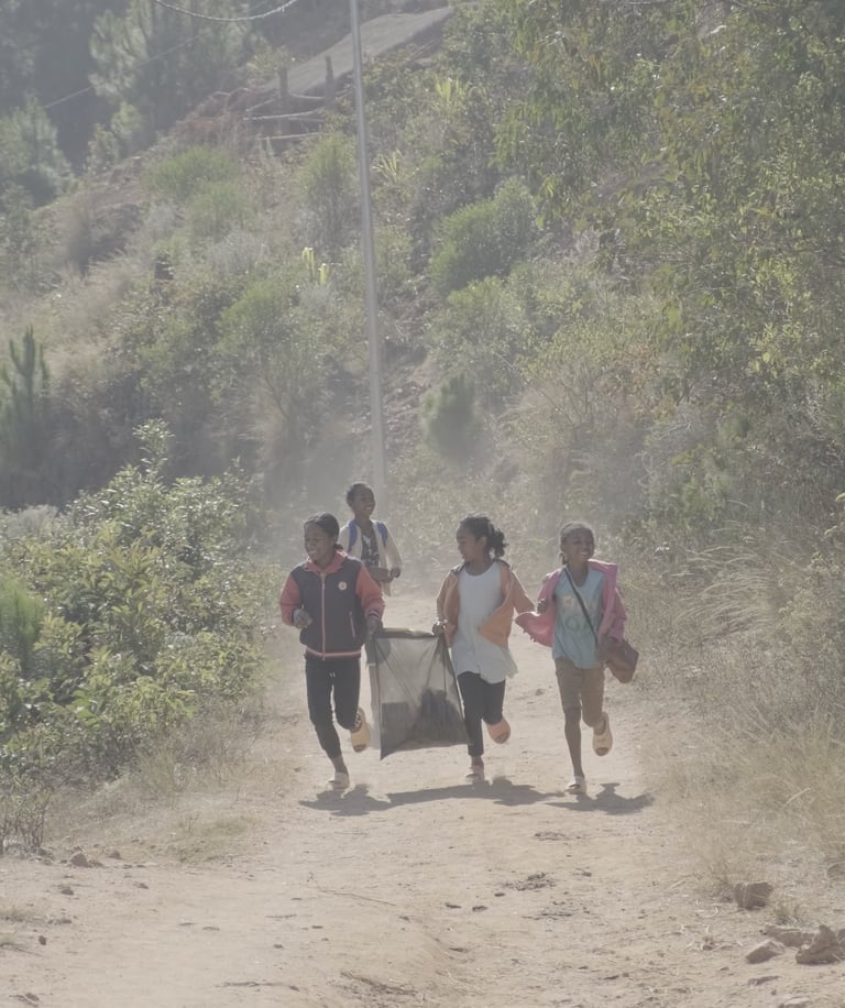 Les enfants et villageois se réunissent et nettoient la région de leur village. Les déchets ramassés sont pesés puis incinérés. A la fin de l'année, nous comparons la quantité récoltée dans chaque sous forme de petit concours.